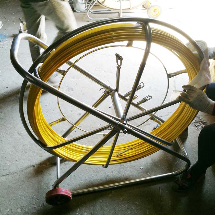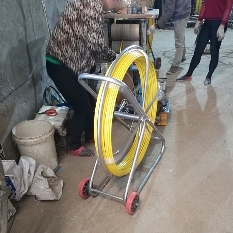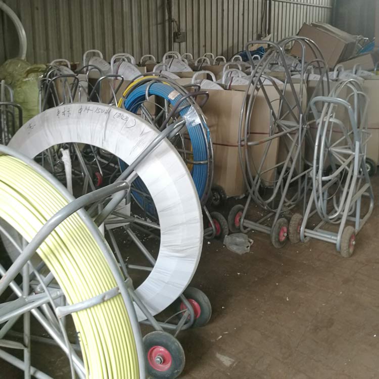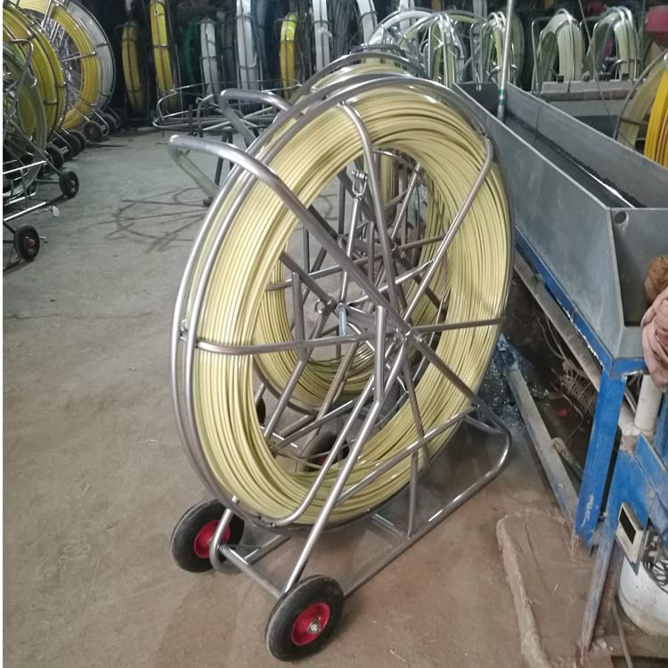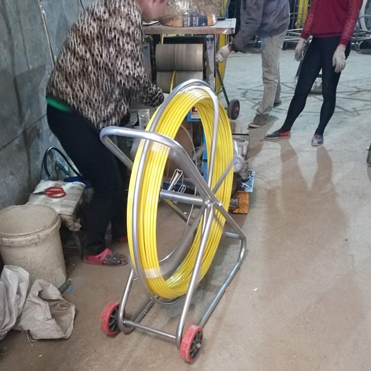 线缆穿线器,玻璃钢材质制成的放线穿线器,我厂生产的穿线器采用的是进口材质的玻璃纤维,加上钢芯组成。这种牵引穿线器的好处是韧性好,还耐磨,操作起来也是十分的方便,施工人员可以通过轮子式架子,把穿线器推到指定的施工地点,然后在把玻璃钢穿线器放开,找到应该施工的孔位,然后缓缓的放到子管里边,在通过穿线器把需要铺设的线缆牵引过来,从而完成施工。