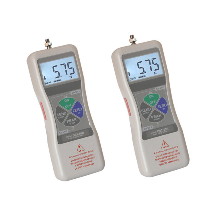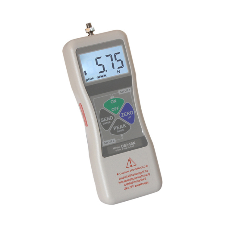 数显推拉力计,是一种用于推力及拉力测试的力学测量仪器。数显推拉力计适用于电子电器、轻工纺织、建筑五金、打火机及点火装置、消防器材、制笔、制锁、渔具、动力机械、科研机构等行业的推拉负荷测试。 如:在化妆品行业中用于头发断裂力的测试;在包装行业中用于测量胶带、薄膜等包装材料的强度等。数显推拉力计有强大的数显功能,操作更加简单方便。 数显推拉力计的主要特点 1、高精度高分辨率; 2、五种测试模式、三种显示方式可供选择--提高测试效率; 3、kg(公斤)、lb(榜)、N(牛顿)三种计测单位可供选择、相互换算; 4、重力加速度值设置功能---用户可自行输入使用地的重力加速度值。使测试及单位换算更为; 5、峰值保持功能,保持峰值显示直至手动清零; 6、自动峰值功能,保持显示峰值2秒后自动解除; 7、可设定上下限及比较值做统计分析,超过比较值蜂鸣报警; 8、数据储存功能,可储存128位测试值; 9、数据输出功能,可将数据通过数据线输入电脑做各种分析; 10、绿色环保,10分锺无操作自动关机; 11、高品质充电电源,充电电压从100V至240V可用,可适应国内外绝大多数地区。还有短路、漏电、过载保护功能; 12、2套安装尺寸,适应国内外多数测试机台,方便用户安装到机台上使用; 13、特有的开关接点通断力测试功能,使开关通断力测试更; 14、6位大屏幕显示; 规格参数: 型号 容量 显示 分辨率 DB-5N 5N 5.000N 0.001N DB-20N 20N 20.00N 0.01N DB-50N 50N 50.00N 0.01N DB-100N 100N 100.00N 0.01N DB-200N 200N 200.0N 0.1N DB-500N 500N 500.0N 0.1N DB-1000N 1000N 1000.0N 0.1N