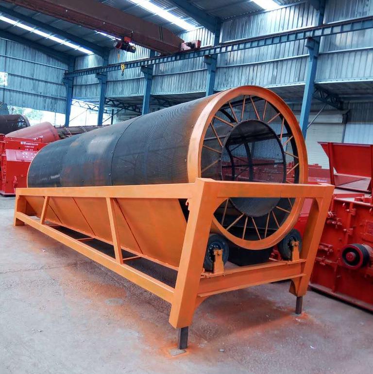 滚筒筛是代新型的筛料设备。滚筒筛主要有电机、减速机、滚筒装置、机架、密封盖、进出料口组成。整体与地平面成倾斜状态,外部被密封隔离罩所密封,以防止污染环境。通过变速减速系统使筛分筒在定转速下旋转,物料自上而下通过筛分筒得到分离,细料从筛分筒前端下部排出,粗料从筛分筒下端尾部排出。