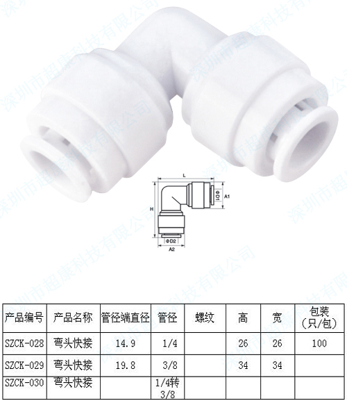 □产品名称:快接 □产品材料:POM □接口孔径:快接1/4,外牙2分、3分、4分 □使用压力:1-8 bar □耐压范围:<8kg/cm2 □适用范围:净水器,纯水机通用型,不同规格不同价格。2分的2元一个,3分的一个4元,4分的一个5元! 1/8=02 1/4=04 3/8=06 1/2=08