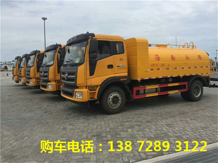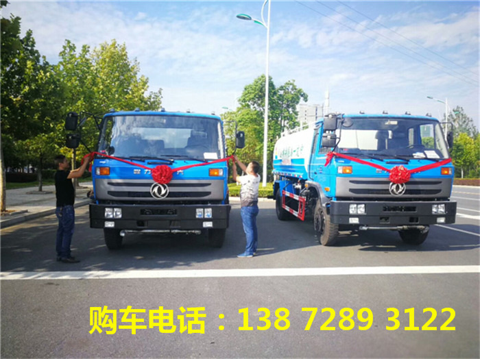 6.东风平头145洒水车:该车采用东风原装底盘,平头蓝色前翻驾驶室,东风康明斯170马力柴油发动机和广西玉柴160马力,9.00-20尼龙胎,带方向助力, 带增压,断汽刹,6档变速箱,罐体有效容积:10吨-13吨,该车带免征公告。(图上)
