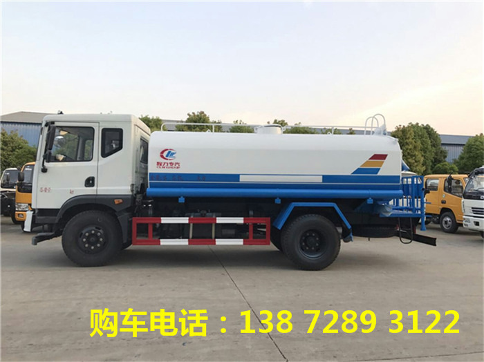 洒水车罐体材质为Q235国标碳钢,厚度为4MM,带大功率专用洒水泵,前冲、侧喷、后洒,带后工作平台和洒水高炮,高位花洒。