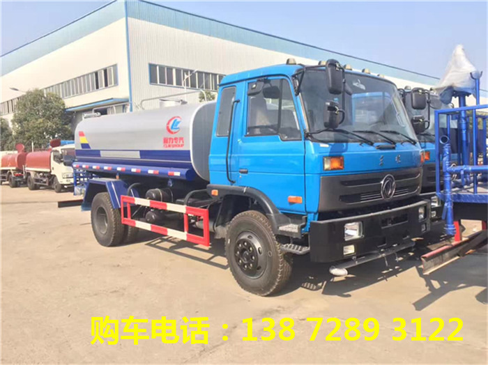 6.东风平头145洒水车:该车采用东风原装底盘,平头蓝色前翻驾驶室,东风康明斯170马力柴油发动机和广西玉柴160马力,9.00-20尼龙胎,带方向助力, 带增压,断汽刹,6档变速箱,罐体有效容积:10吨-13吨,该车带免征公告。(图上)