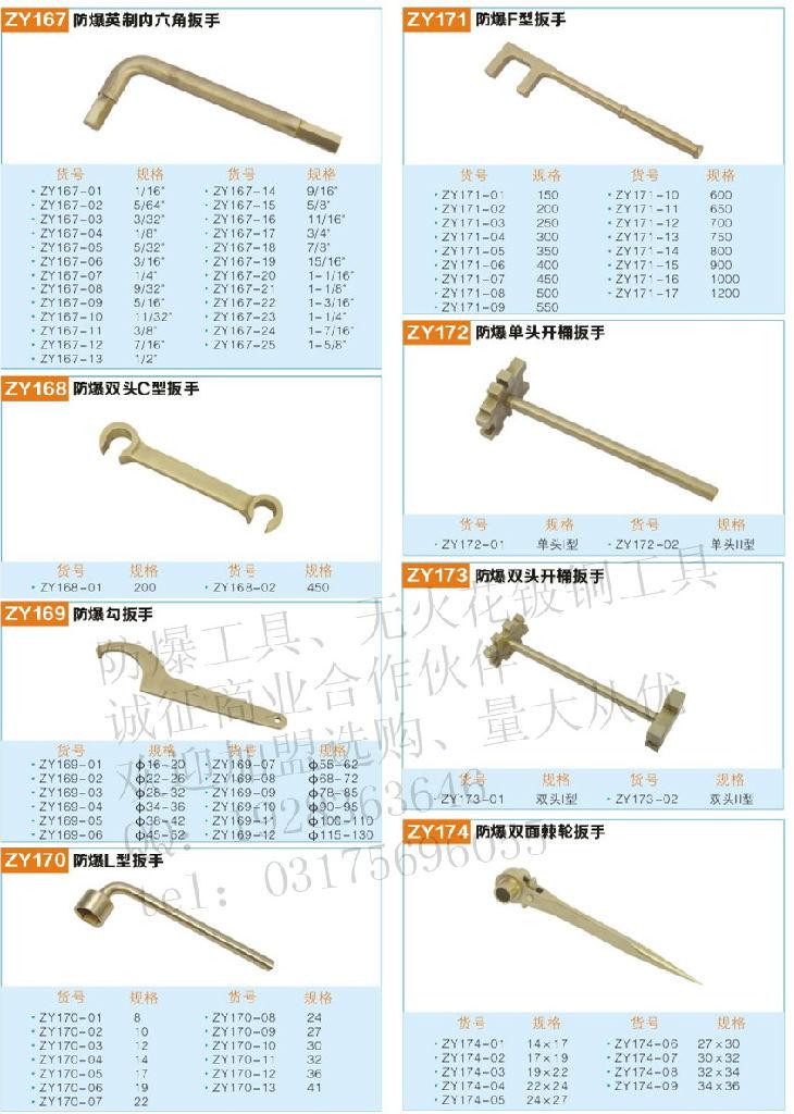@联系方示:QQ1928363646,电话13303077632 沧州志远防爆工具有限公司生产的防爆工具包括以下几大类:一、防爆人体静电释放器,静电接地报警器,防爆组合套装工具,防爆安全带、防静电安全带,防爆手拉葫芦、防爆手动单轨小车;二、各种防爆扳手、如防爆梅花扳手,呆扳手、敲击扳手,活扳手,两用扳手,内六角扳手等;三、防爆锤子类,如黄铜锤、紫铜锤,防爆八角锤、防爆奶头锤、防爆圆鼓锤,防爆斧子,安全斧等;四、防爆泥子刀、防爆除锈刀、防爆螺丝刀,防爆扁铲,防爆听针、防爆挫类;五、防爆撬棍,防爆F型扳手,开桶扳手,棘轮扳手,快速加力扳手类;六、防爆钳子、管钳子,克丝钳,链子钳,鲤鱼钳,胡桃钳,水泵钳,鲤鱼钳,断线钳,防爆剪刀、台虎钳等;七、防爆**、手摇油泵,锯弓子,鸡尾锯,法兰支开器,防爆锨,防爆镐头,防爆听针,防爆打包机类;八、防爆提油泵、防爆消除桶、防爆拉马,盆,刷,镊子,防爆手电筒,瓦刀,刮刀,除锈铲,防爆尖锨,防爆方锨,防爆两用锨,法兰静电跨接线等杂品九、防爆组合套装工具类.加油站专用;油库专用;天然气专用,矿山抢险专用;检维修专用;成品油专用工具箱;配电室专用工具箱;便民工具箱,计量工具箱,栈桥专用工具箱,防爆7件套,8件套,9件套,10件套,11件套,13件套至100件套十:防爆套筒及附件类、(17件套、28件套、50件套、100件套)不锈钢工具,防磁工具,平台量具、石油器材类。