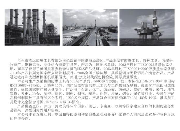 @联系方示:QQ1928363646,电话13303077632 沧州志远防爆工具有限公司生产的防爆工具包括以下几大类:一、防爆人体静电释放器,静电接地报警器,防爆组合套装工具,防爆安全带、防静电安全带,防爆手拉葫芦、防爆手动单轨小车;二、各种防爆扳手、如防爆梅花扳手,呆扳手、敲击扳手,活扳手,两用扳手,内六角扳手等;三、防爆锤子类,如黄铜锤、紫铜锤,防爆八角锤、防爆奶头锤、防爆圆鼓锤,防爆斧子,安全斧等;四、防爆泥子刀、防爆除锈刀、防爆螺丝刀,防爆扁铲,防爆听针、防爆挫类;五、防爆撬棍,防爆F型扳手,开桶扳手,棘轮扳手,快速加力扳手类;六、防爆钳子、管钳子,克丝钳,链子钳,鲤鱼钳,胡桃钳,水泵钳,鲤鱼钳,断线钳,防爆剪刀、台虎钳等;七、防爆**、手摇油泵,锯弓子,鸡尾锯,法兰支开器,防爆锨,防爆镐头,防爆听针,防爆打包机类;八、防爆提油泵、防爆消除桶、防爆拉马,盆,刷,镊子,防爆手电筒,瓦刀,刮刀,除锈铲,防爆尖锨,防爆方锨,防爆两用锨,法兰静电跨接线等杂品九、防爆组合套装工具类.加油站专用;油库专用;天然气专用,矿山抢险专用;检维修专用;成品油专用工具箱;配电室专用工具箱;便民工具箱,计量工具箱,栈桥专用工具箱,防爆7件套,8件套,9件套,10件套,11件套,13件套至100件套十:防爆套筒及附件类、(17件套、28件套、50件套、100件套)不锈钢工具,防磁工具,平台量具、石油器材类。