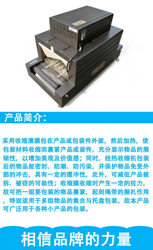 收缩包装是目前国际市场上较先进的包装方法之一。它是采用收缩薄膜包在产品或包装件外面,然后加热,使包装材料收缩而裹紧产品或装件,充分显示物品的展销性,以增加美观及价值感;同时,经热收缩机包装后的物品能密封、防潮、防污染,并保护物品免受外部的冲击,具有一定的缓冲性,此外,可减低产品被拆、被窃的可能性;收缩膜收缩时产生一定的拉力,故可把一组要包装的物品裹紧,起到绳带的捆扎作用,特别适用于多组物品的集合与托盘包装,故本产品可广泛用于各种小产品的包装。广泛应用于食品、饮料、医药、日化、五金、木制品、文化用品、印刷制品、塑料制品、玻璃制品、电子元件等产品的单一、集合或组合包装。