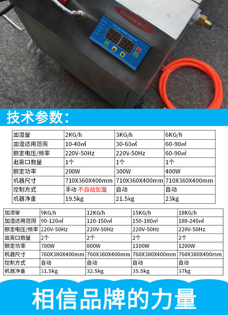 机器净重 31.5kg 32.5kg 35.5kg 37kg 加湿量 9KG/h 12KG/h 15KG/h 18KG/h 加湿适用范围 90-120㎡ 120-150㎡ 150-180㎡ 180-240㎡ 额定电压/频率 220V-50Hz 220V-50Hz 220V-50Hz 220V-50Hz 出雾口数量 2个 2个 2个 2个 额定功率 700W 800W 1100W 1200W 机器尺寸 760X380X400mm 760X380X400mm 760X380X400mm 760X380X400mm 控制方式 自动 自动 自动 自动