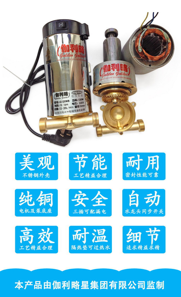 ☆产品概述本泵采用不锈钢屏蔽套将水与线圈绕组彻底隔离,无须机械密封,从而彻底解决了水泵漏水的问题,采用陶瓷轴承,使用寿命更长,并彻底解决了噪声问题。置自动开关,使用更方便。部分泵体铜质材料不生锈,用水更卫生。主要用途本泵适应于110℃以下的冷热水增压循环。特别是沐浴器因水压不足点火困难或水压不稳容易失火,安装本泵可以彻底解决问题;自来水压过低时增压供水;太阳能热水器增压供水;锅炉热水循环增压;工业设备液体增压循环、鱼池、鱼缸循环增氧,家用暧气、地暧水循环等。 ☆技术参数: