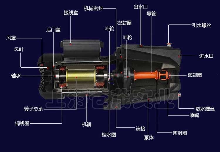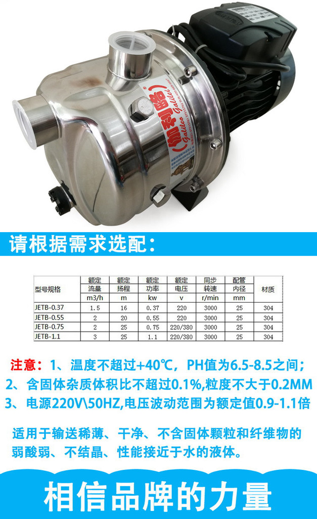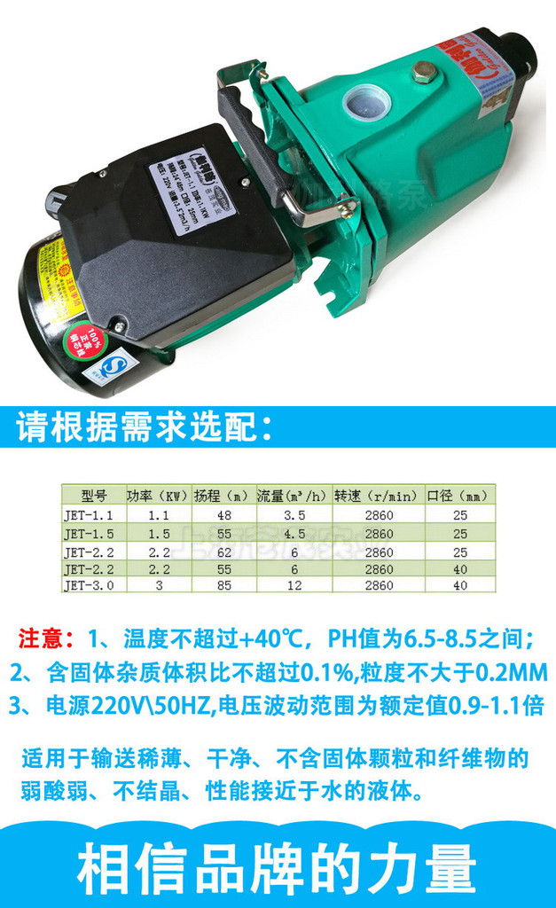 JET自吸喷射泵,由电动机、密封、水泵三部分组成。电动机为单相异步电动机,泵部分为离心式叶轮,径向导叶结构。水泵和电动机之间采用单端机械密封,固定止口密封处采用“O”形耐油橡胶密封圈作静密封。它由小型电动机直接链接,具有外表美观,体积小,重量轻和结构紧凑优点。同时,具有十分轻便,耗电省,安培育、便用方便。