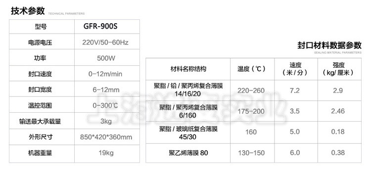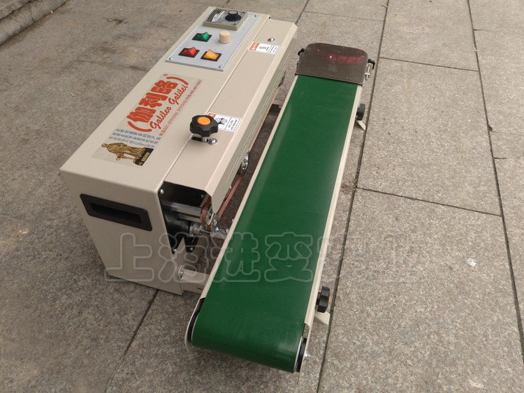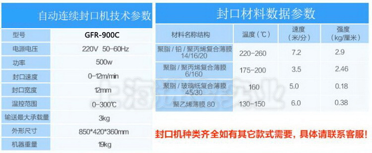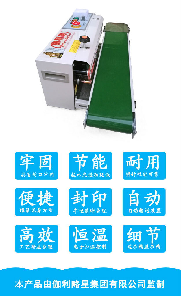 GFR-900自动薄膜封口机 自动塑料薄膜连续封口机采用电子恒温控制和自动输送装置,可制各种不同形状的塑料薄膜袋,能在各种包装流水线上配套使用,其封口长度不受限制;具有连续封口效率高,封口质量可靠,结构合理,操作方便特点。在封口的同时还可直接印上出厂日期或有效期随需更换,使用方便,让您包装更卫生,使用更长久。 多功能薄膜连续封口机是从国外引进样机,经解剖、消化,同时根据国内实情而重新设计加以创新的新型包装机械,适用于普通单层塑料薄膜几复合薄膜等一切可热封的封口,凡需用以上材料包装产品的行业如食品、医药、化工、军工、服装、土特产及电子元件等,均可满意使用。