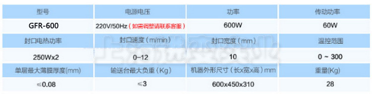GFR600自动薄膜封口机 本机适用于塑料薄膜的封口、制袋,可广泛应用在食品、医药、化工、日用、种子等行业。 由于本机采用电子恒温控制和无调速的传动机构,可封制各种不同材料的朔料包装袋,由于本机器体积小,应用广泛,封口长度不受限制,所以可与各种包装流水线配套使用。它将是工厂、商店批量产品包装的较佳封口设备。