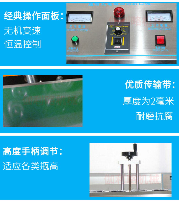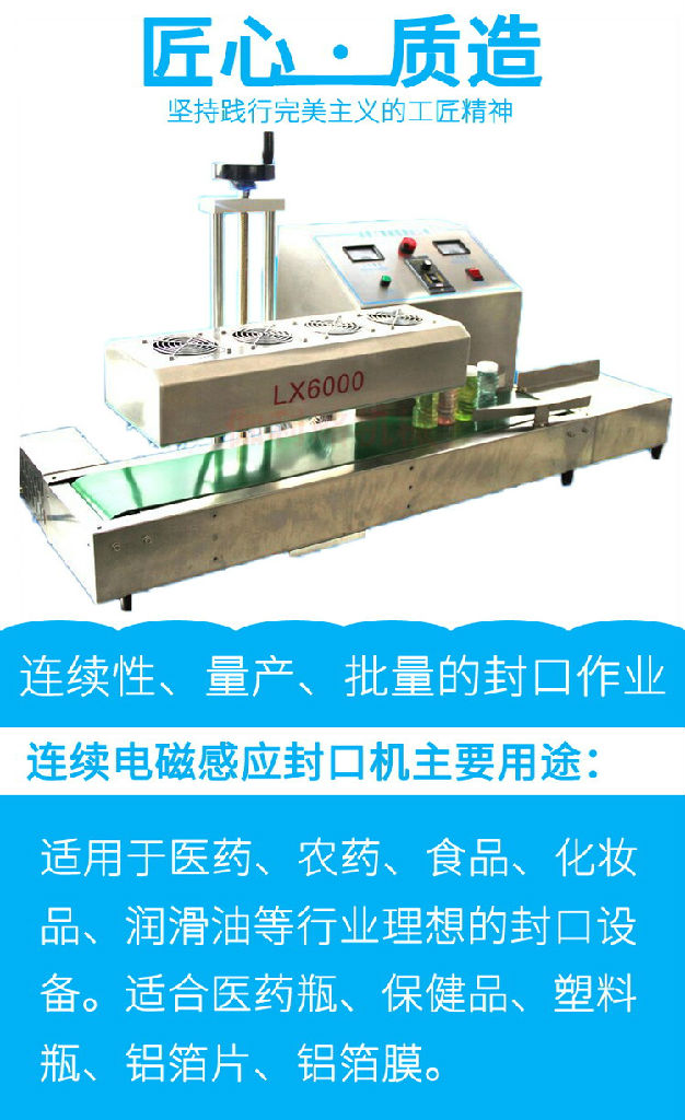 GLGYF-1500A-I台式连续电磁感应封口机 加热铝塑复合材料的电磁感应密封技术不接触对象,具有先进性和在国内外广受欢迎。电磁感应封口机原理设计的是高质量的空气非金属瓶等塑料和玻璃瓶密封的必要设备,广泛应用于医药、农药、油脂、食品、健康食品、子、饮料、化妆品及化工领域。目的是为了促进产品的质量,加强密封和质量保护的能力。