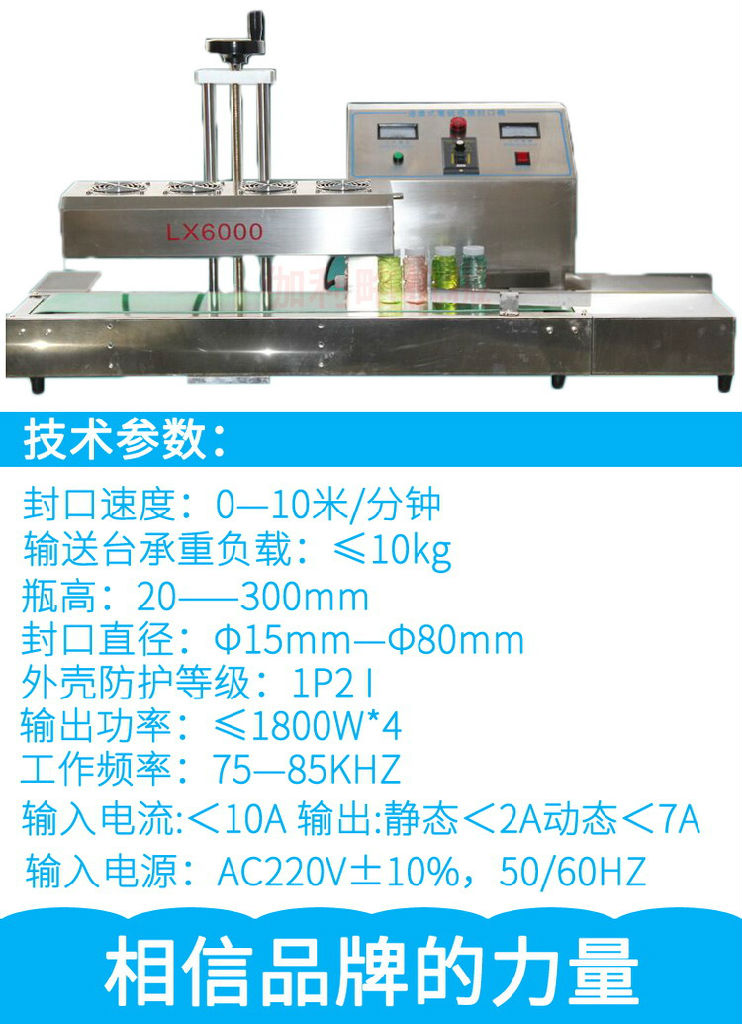 将本机在工作台上放稳, 接通电源(220V,插座能承受10A以上电流)打开电源开关,此时控制面板上电压、封口时间数码管亮, 此时显示的电压数值为当前电源输入电压值此时显示的封口时间为初始值,操作人员应根据被封物的要求调整封口时间试封操作准备被封物应基本上对准感应头中心,偏差不得超过1 / 3直径。 根据被封物直径调整封口时间 试封, 把已上感应膜(有铝箔的面对准瓶口)的瓶子放存感应头下,按感应头上端的按钮,此时面板上热封时间呈变化,待回复至设定值时,封口完成。