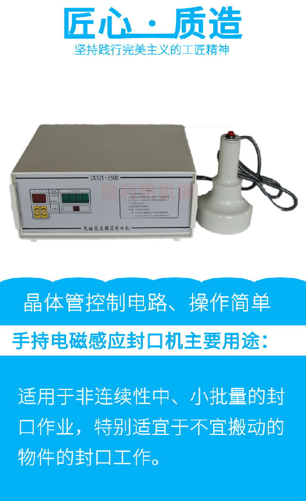 GDGYF-S500手持式电磁感应封口机 GDGYF系列便携式感应封口机采用电磁感应加热原理,通过非接触感应加热,使感应膜、铝箔复合膜(注:本机对无铝箔的复合膜及通过真空镀铝的复合膜无效)瞬间产生热量熔化,牢牢地粘贴在被封物瓶(杯)口上,以达到密封口之目的。通过感应加热封口的产品,无论是对提高产品档次、防止自然吸潮、延长保质期限、加强防伪性能以及封口速度和封口质量都有明显的提高。目前已广泛应用于医药、农药、农药、润滑剂、化妆品等行业的密封包装机。 概要:主要适用于非连续性中、小批量的封口作业,特别适宜于不宜搬动的物件的封口工作。该系列电磁感应封口机不适宜在酸、碱度重、湿度高及粉尘多的恶劣环境中长时间使用。本机属于通用型水平感应机型,主要用于上述直径范围内的普通瓶盖的封口作业。