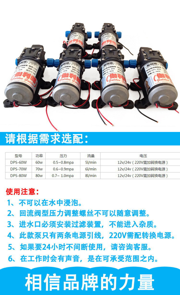 3、进水口必须安装过滤装置,不能进入杂质。否则,容易堵塞水泵,造成压力降低乃至不出水。 4、此款泵只有两条电源引线,不配电源。如在车上用要配点烟头电源线或电瓶夹线,如要用220V的电,请配转换电源。
