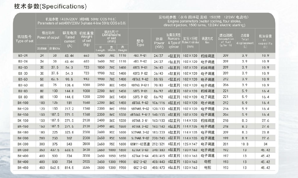 一、东风康明斯公司简介:东风康明斯发动机有限公司主要生产康明斯B、C、D/L系列机械式和ISDe、ISLe、ISZ系列全电控柴油机,B系列天然气发动机,D系列船用发电机,发动机排量为3.9L、4.5L、5.9L、6.7L 、8.3L、8.9L、13L,功率覆盖范围为125-545HP。公司产品满足国Ⅱ、国Ⅲ、国Ⅳ排放法规要求,可广泛应用于轻、中、重型载重汽车、中大型城际客车、大中型公交客车、工程机械、船用主辅机、发电机组等领域。二、东风康明斯发电机/发电机组产品概述1)发电机组的设计、生产和测试完全符合GB/T2820-97标准。2)配备康明斯发动机,技术先进,性能可靠,工作寿命长。3)发电机激磁系统能使机组在随任何瞬间加载时,频率波动迅速恢复。4)发电机低电搞设计使非线性负载下的波形失真极小,并有良好的起动电动机能力。5)康明斯公司对全系列产品提供质量保证。6)康明斯公司建设遍布全国的专业服务网络,为客户提供24小时售后服务和零配件供应。三、东风康明斯参数表: