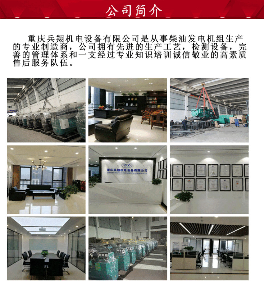 重庆兵翔机电设备有限公司专业销售自动化、静音、移动电站、发电机、柴油发电机组,采用一体化设计,完全独立的配置,可满足任何情况下的用电要求,实现真正意义上的应急供电,公司拥有先进的生产工艺,检测设备,完善的管理体系和一支经过专业知识培训诚信敬业的高素质售后服务队伍。公司自成立以来,一直坚持以客户的需求为导向,以客户满意为宗旨的原则,立足质量、服务取胜的指导思想,不断发展状大。“兵翔”牌发电机组严格按照国际GB/2820.5-1997标准生产,公司供、产、销全过程严格执行ISO9001-2000质量管理体系的标准。