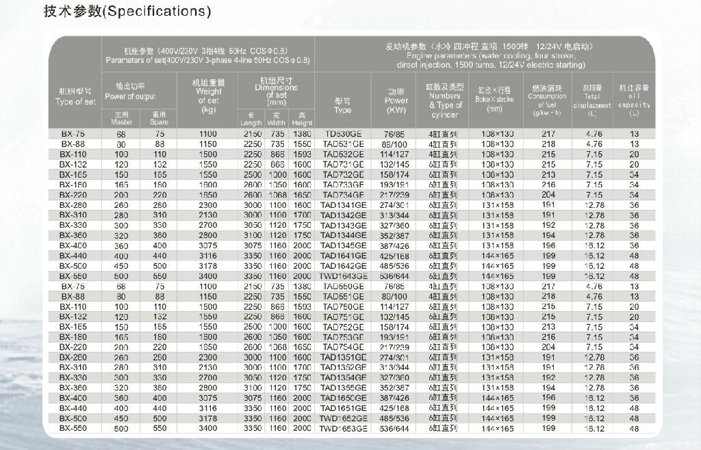 二、沃尔沃柴油发电机组参数: