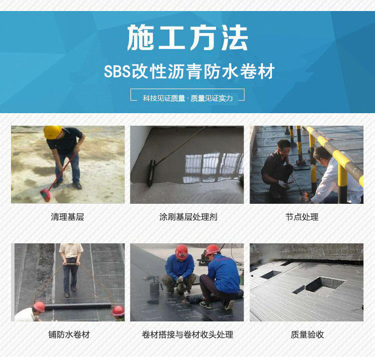 2、卷材搭接缝宽度 SBS改性沥青卷材防水层一般采用热熔粘法施工,故要求长边的搭接缝宽度均不得小于80㎜,短边不得小于100㎜。为确保搭接缝的宽度,应先进行卷材试铺,无问题后方可进行正式铺贴。