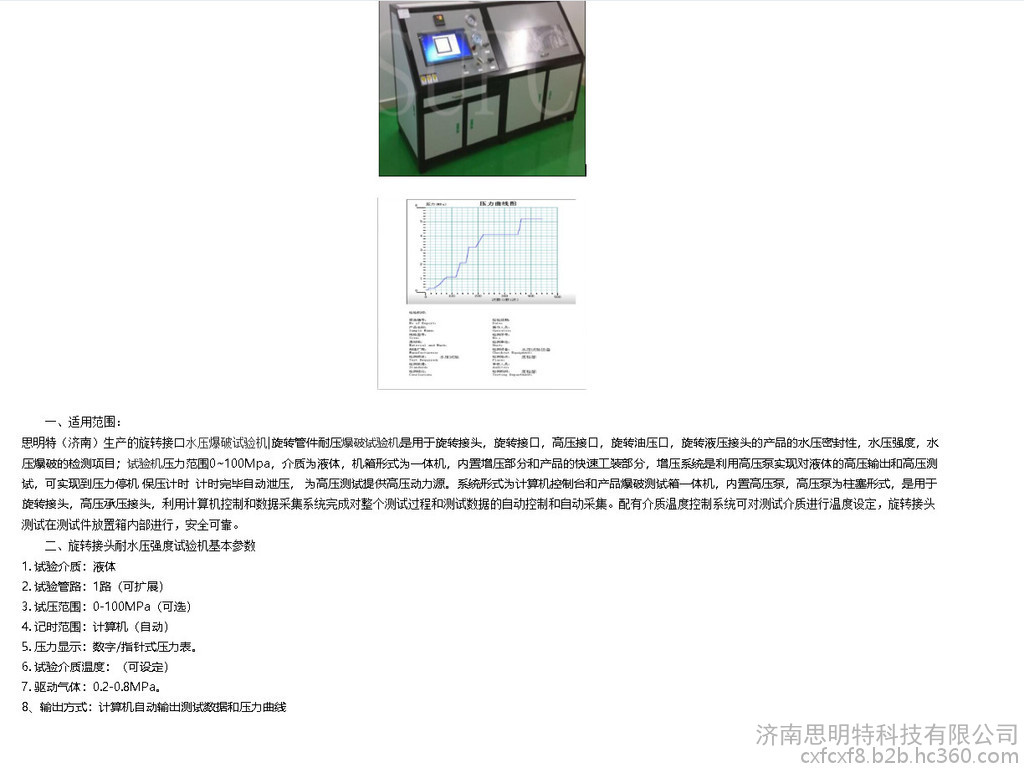 | 一、应用范围: 济南思明特开发的防爆电器水压试验机可以进行防爆外科水压试验试验,根据GB_3836[1].2-2000性气体环境用电气设备_第2部分中的15.1.2.静压试验,打压压力1-1.5Mpa,设定时间达到时间后自动卸压,夹紧力吨位200T,广泛用于各种防爆电器外壳,防爆开关,变频器,软启动开关等壳体的水压试验。 二、设备构成 1.水压试验机打压装置,采用大流量增压泵打压。压力1Mpa,可任意调节。 2.压紧装置,采用液压站自动压紧。高吨位达到200T的压力。 3.推车输送装置。可以将被测试防爆外壳放到推车上自由移动。 4.充水装置,快速大流量充水。 三、设备特点 1、配备控制装置,可轻松实现输出压力、时间任意可调、可控。 2、技术先进,结构设计合理。自动压紧无需人工操作压紧。 3、可配备自动数据采集系统,观察压力曲线,打印报告。保存压力测试数据到excel表格。方便以后查阅。四、防爆电器水压试验机技术参数 1、数据记录:可选择人工记录与电脑记录。 2**大压力:1Mpa,压力在一定范围内可以调节。 2**大夹紧力:200T压力,可以根据被测试件的大小选择相应的压力吨位数。 3、时间控制:通过时间继电器控制时间,达到一定压力后自动卸压。 4、工作介质:水。 5、可根据客户需求配![]() ![]() ![]() ![]() ![]() ![]() ![]() ![]() ![]() ![]() ![]() ![]() ![]() ![]() ![]() ![]() ![]() ![]() ![]() 置数据采集系统 |