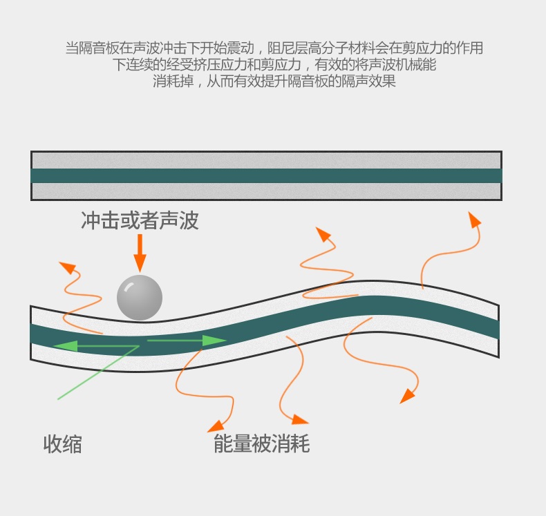 时,板中间的高分子材料会在剪应力的作用下连续的经受挤压应力和剪应力,有效地将声波的机械能转化为热能耗散