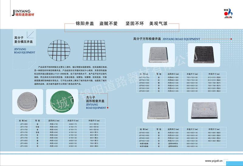 我厂引进、开发的新型高分子树脂模压复合材料检查井盖,秉承“绿色环保”的理念,采用不饱合树脂、玻璃丝等化工原料,辅以钢筋加强,经高温高压复合而成。产品优点: