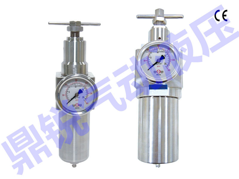 3、调压阀可单独使用,但调压阀进气口前端设置分水滤气器效果更佳。因未经分水滤气器过滤的空气的冷凝水,油污及灰尘会堵塞调压阀,使调压阀动作不良。若下游回路需要给油,油雾器应安装在不锈钢减压阀QTY系列DN15 DN20 DN25 DN40 DN50出气侧。当与分水滤气器、油雾器组合使用时,应按分水滤气器安装于进气方向最前面,调压阀次之,最后是油雾器。