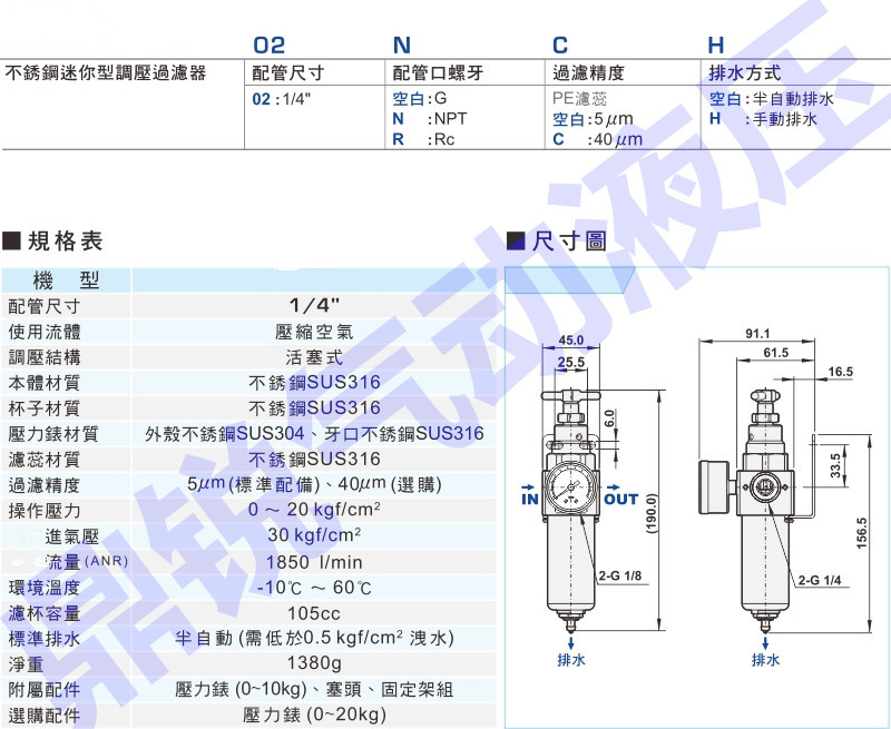 l 内置5微米滤网,可以过滤气源中的微小颗粒,并且可以通过排水盖排出凝集水。