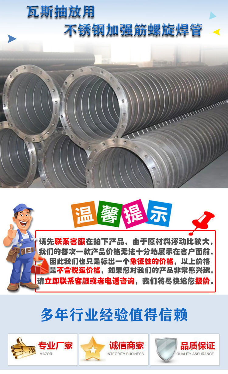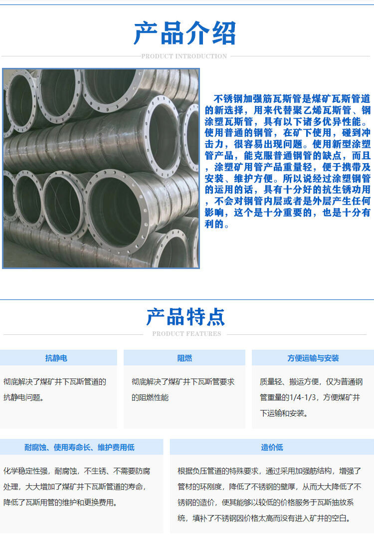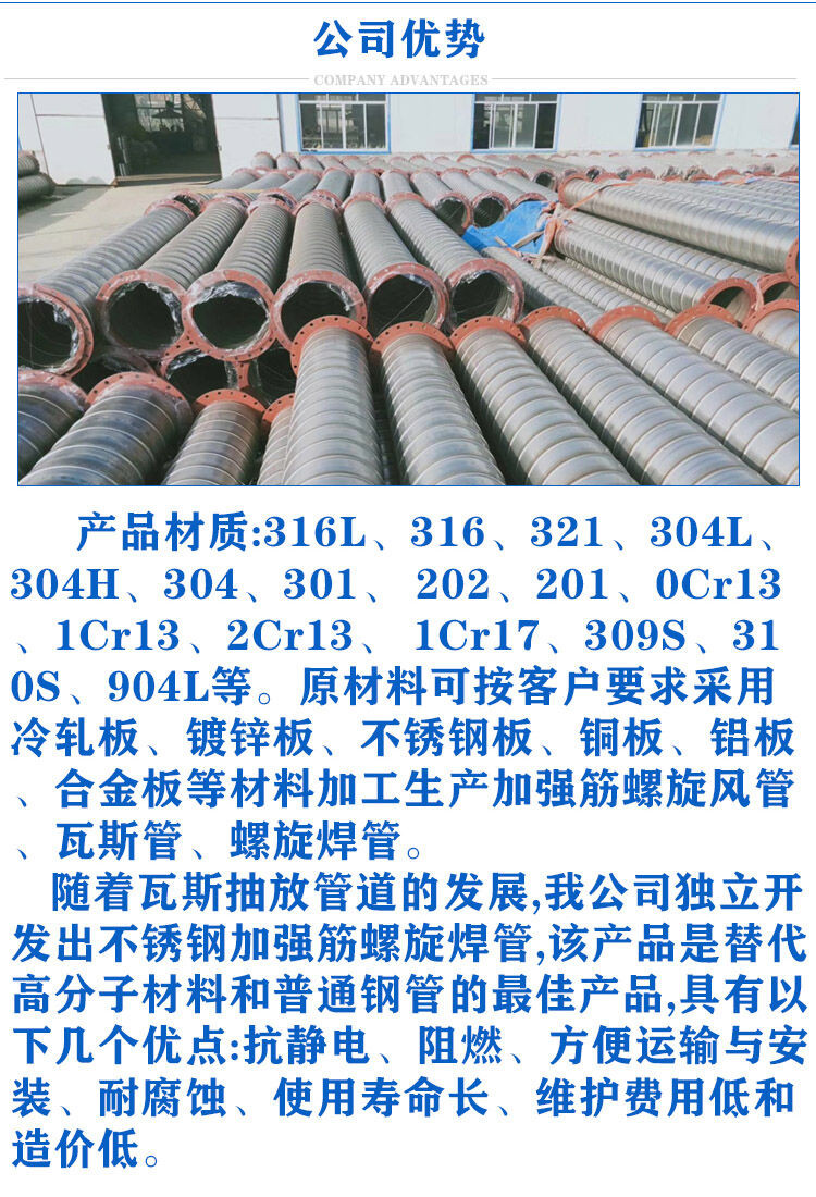 我公司是致力于煤矿瓦斯管路研发生产的厂家, 生产的不锈钢加筋加强螺旋焊管是采用, 不锈钢加筋板螺旋焊接而成的管体,管体上具有至少一根的双波螺旋状加强筋。我公司在不锈钢螺旋焊管的管体上增加了螺旋状双波加强筋,加强了不锈钢螺旋焊管的环刚度,对于同样的负压工作,在能够满足煤矿井下抽放瓦斯用管的性能指标的前提下,可减少焊管管壁的厚度,从而解决了薄壁不锈钢螺旋焊管在负压工作中容易吸瘪变形的问题,并节约了成本,使得不锈钢螺旋焊管能够以较低的价格和更高的稳定性应用到煤矿瓦斯抽放系统中。该产品具有耐腐蚀、高强度的性能,并满足阻燃、抗静电的要求.双法兰连接瓦斯抽采管 不锈钢螺旋咬缝焊管 卡箍连接瓦斯抽采管 厂家