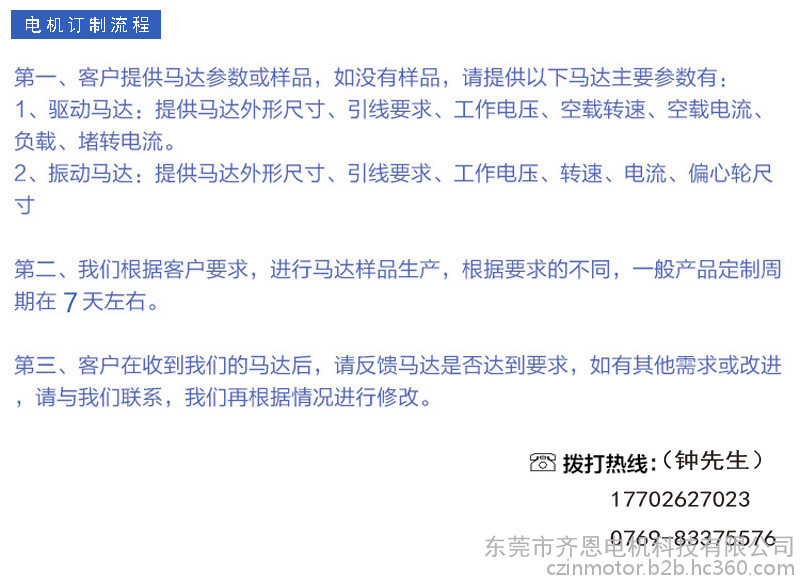 东莞市齐恩电机科技有限公司是微型马达、振动电机、玩具电机、空心杯马达、12系列马达、N系列马达、M系列马达产品专业生产加工以及振动方案研发的公司,拥有完整、科学的质量管理体系