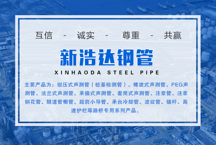 公司以“高效、节能、实用、创新”的产品研发生产理念,专业生产加工钢管及其各种桥梁材料。主要产品为:钳压式声测管(桩基检测管)、螺