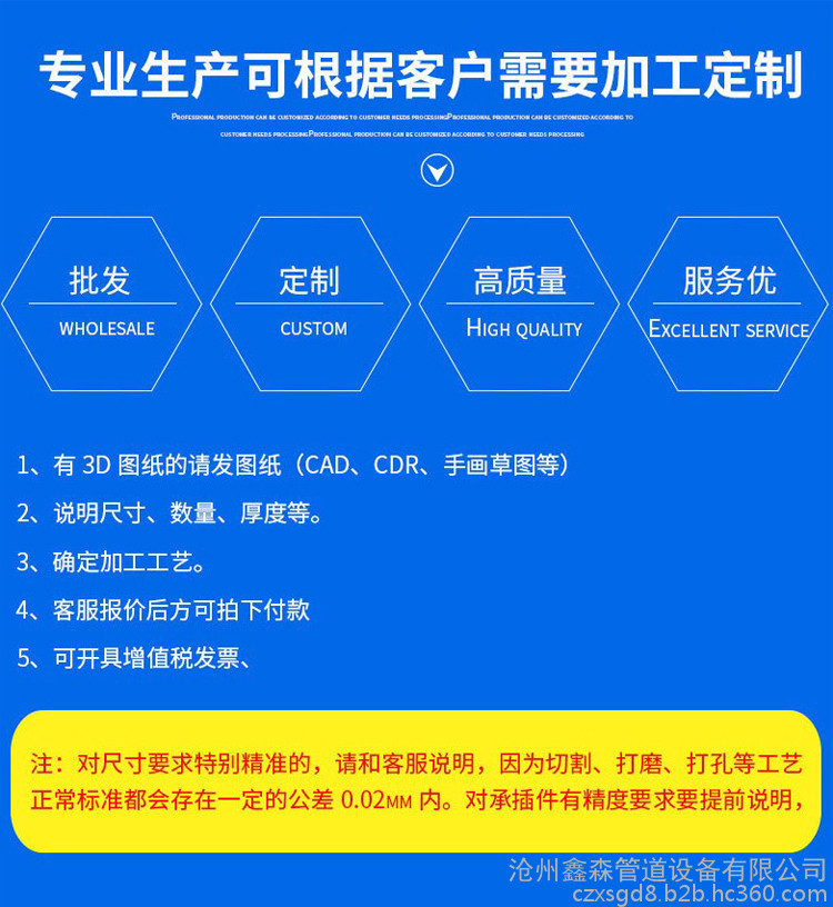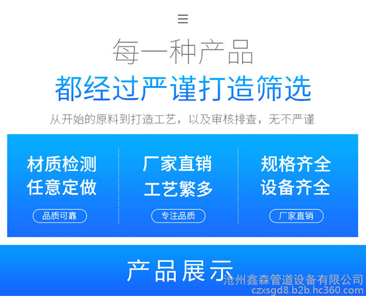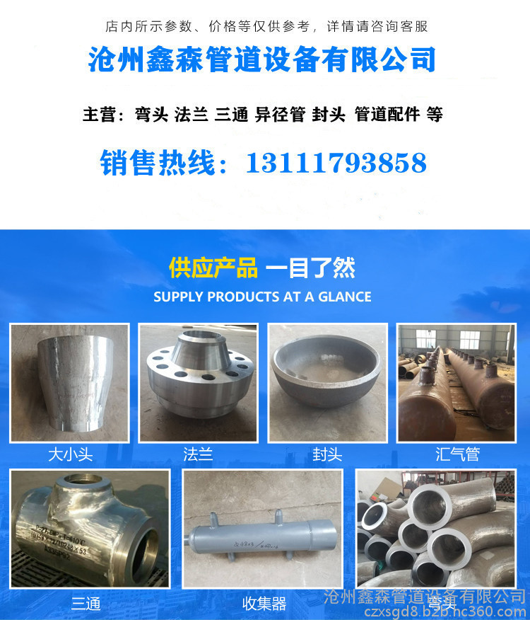 沧州鑫森管道设备有限公司位于河北省孟村回族自治县张官店工业区,环境佳,交通便利。是河北一家集生产和销售为一体的大型管道管件厂家,我公司常年生产供应国标弯头、出口弯头、对焊弯头、平焊法兰,对焊法兰,三通,弯管等石化系列管件,保温、防腐管道一体化公司。我公司产品规格齐全,材质齐全,适用于电力、石化、化工、制药、供热、船舶、石油、食品等多个行业。