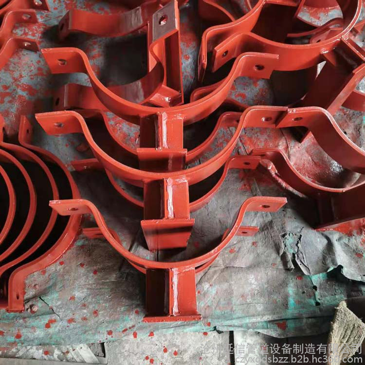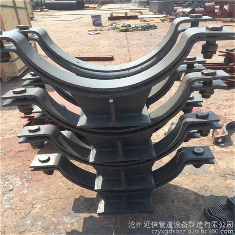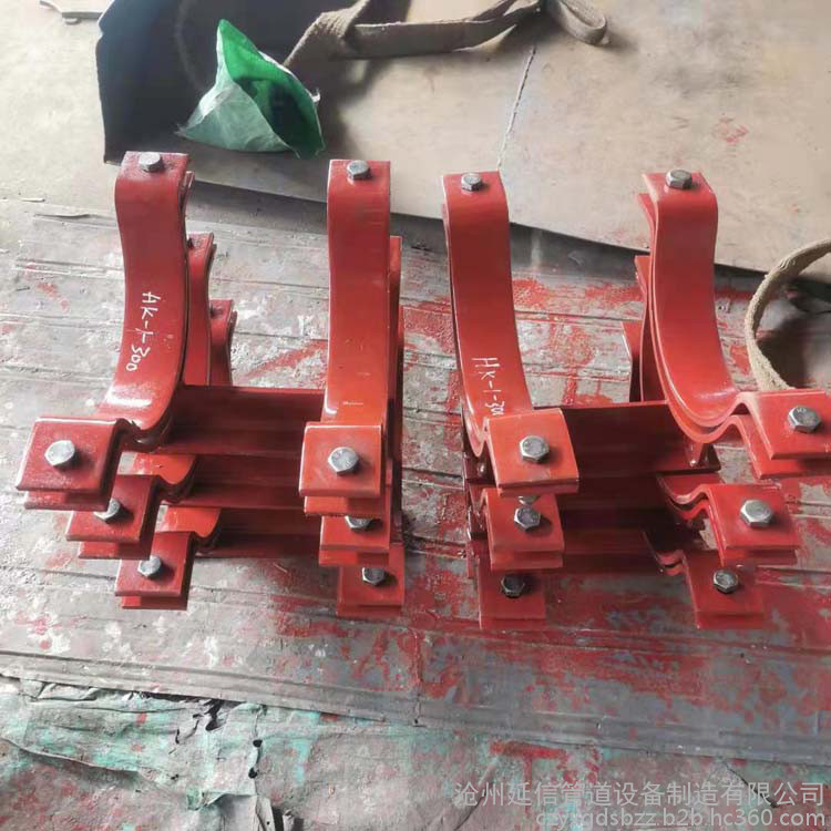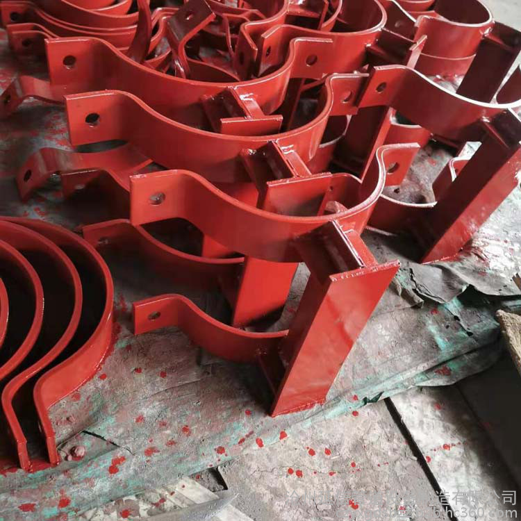 ??管夹滑动支座适用温度范围为300℃-555℃,300℃适用材料为Q235-B,450℃适用材料为20#钢,540℃/555℃适用材料为12Cr1MoV.产品是由2套双孔管夹、1套支座,1块聚四氟乙烯板,1块滑动底板,以及螺栓螺母组合而成;主要生产工艺为压制和焊接。