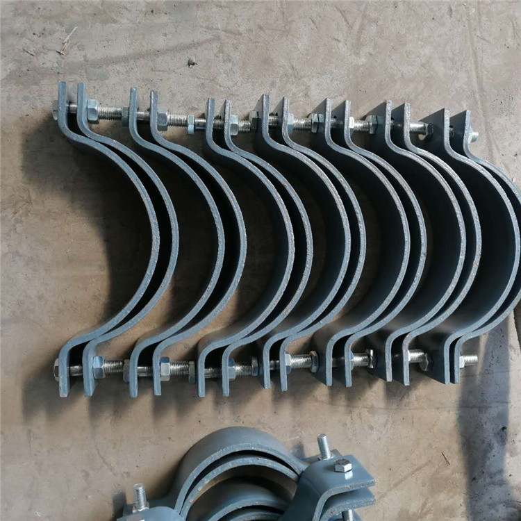 管夹包括螺栓、弹垫、盖板螺栓孔、管夹体、管夹孔、管夹孔A、管夹体螺栓孔、导轨螺母、导轨槽、导轨、平垫、盖板,其特征在于,在螺栓上依次套入弹垫、平垫,将螺栓通过盖板螺栓孔,管夹体螺栓孔后,通过导轨螺母固定在导轨上,所述的导轨槽坐落导轨螺母与导轨的联接处,其作用是防止导轨螺母在导轨上翻滚,所述的管夹体分上、下两部分,中心平行设置二个直径相等的管夹孔,操作时能一起夹紧二根管路,其内径面为多组凹槽型,凹槽型的管夹孔,能与较软的被夹管路完全符合,使管路不易产生串动移位,下管夹体与导轨上导轨螺母联接处,也有一凹槽与导轨螺母符合。双螺栓管夹标准:有A1U形螺栓,A2U形螺栓(带角钢),A3导向管卡,A4紧固管卡,A5基准型双孔螺栓管夹,A6重型双螺栓管夹,A7三螺栓管夹(保温管用),A8三螺栓管夹(支托用),A9双排螺栓管夹,A12管卡(保冷管用),A10四螺栓管夹,A11双排螺栓压紧管卡,A13双螺栓管卡(保冷管用),A14四螺栓管卡(保冷管用),A15双头螺纹吊杆,A16吊环型吊杆,A17松紧螺母,A18角形吊耳,A19U形吊耳,A20倒U形吊耳(焊接型),A21倒U形吊耳(吊杆型),A22板式吊耳,A23垫板,A24支腿加强板,A25联接板。