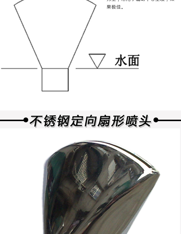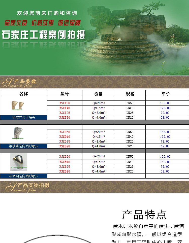 产品特点:喷水时水流自扁平的喷头,喷洒形成扇形水膜。一般以组合造型为主,常用于辅助中心主喷,效果**。