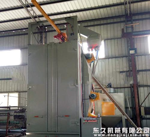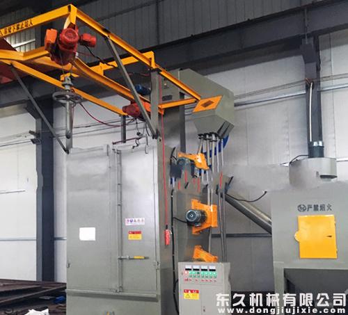 设备的组成和结构的特点: 抛丸清理机为吊钩式清理设备,由抛丸清理室、提升机、分离器、螺旋输送器、两个抛丸器总成、弹丸控制系统、吊钩行走轨道、吊钩系统、自转 减速装置、地基、除尘系统及电气控制部分等组成。
