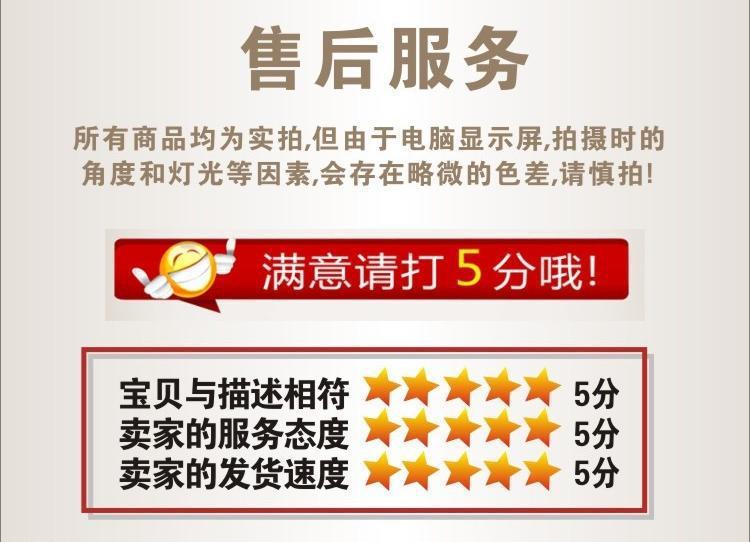 您在收到宝贝后,如果觉得有不满意或者不顺心的事情,请直接联系我们,我们的售后会给您带来满意的答复,您的每个好评是我们提供**的产品,完善服务的动力!