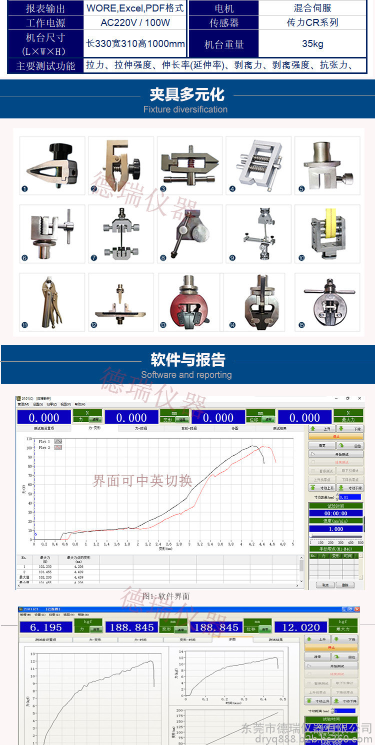 2.标配RS232电脑接口,配专用的专业版测控软件,实时显示力-位移、力-时间、位移-时间、应力-应变等曲线,自动计算**大力、屈服力、平均力、大变形、屈服点、弹性模量等参数,并具有灵活的报表编辑和打印功能;报表可显示并打印拉力强度值(Mpa)。