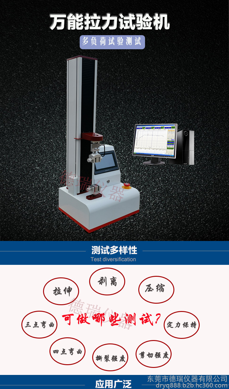 本系列机广泛用于各类薄膜、五金、纽扣、橡胶料、纺织、建材、绝缘体、电线、电缆、端子等各类材料。测试其拉伸、撕裂、穿刺、剥离、抗压、弯曲、抗剪切、定荷重、定位移、三点抗折、四点抗折等各类材料的力学试验及物理性试验。