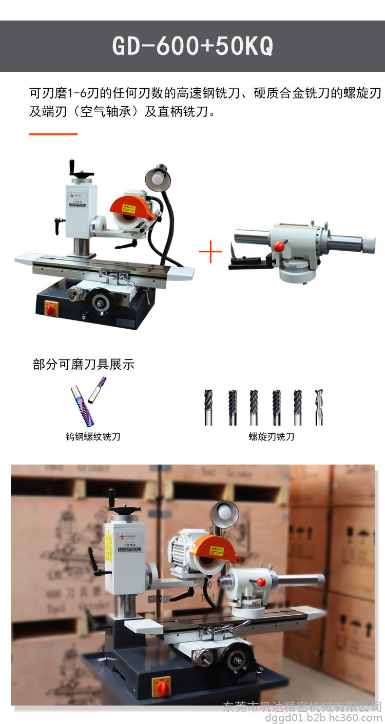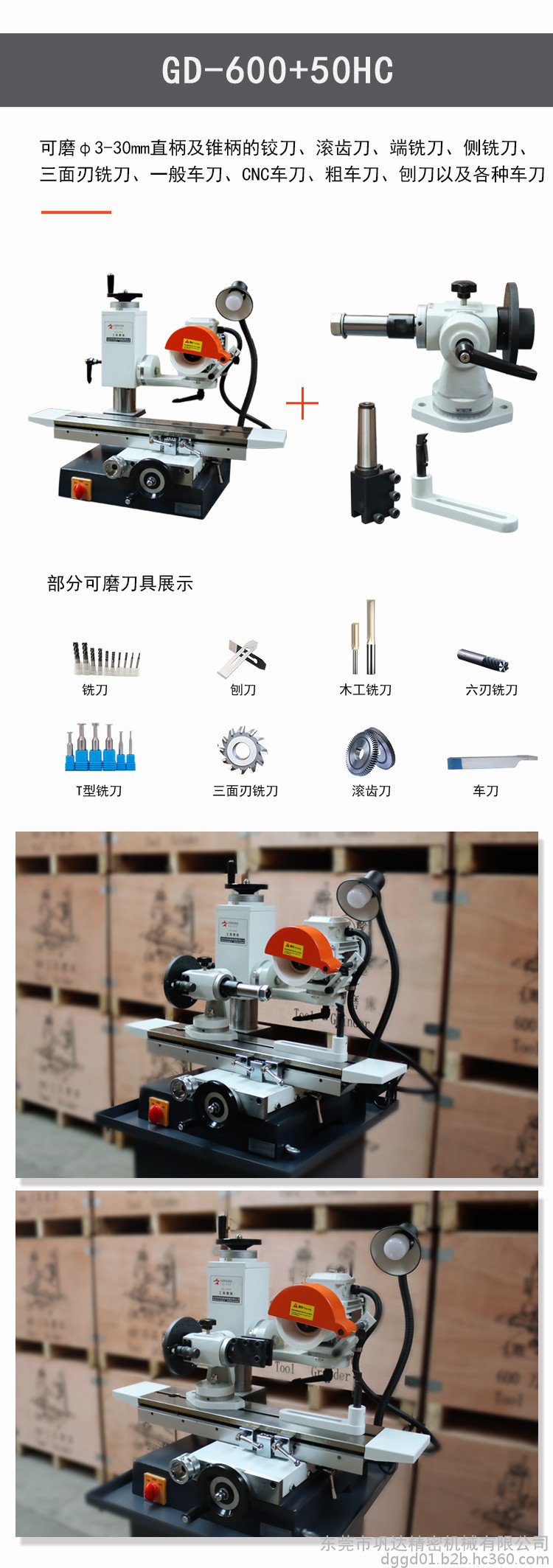 2、配合各种附件可以磨削成型刀,立铣刀,R型铣刀,铰刀,车刀,R型车刀,滚齿刀,钻头,丝锥,雕刻刀,倒角刀,圆切纸刀,平面沟槽,成形面等。