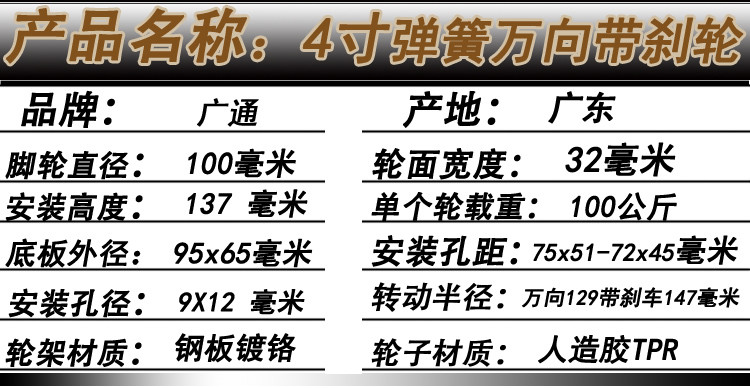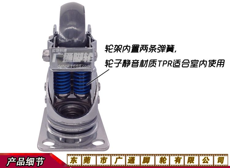 广通4寸万向带刹车双弹簧TPR脚轮工业机械减震防震人造胶滚轮推车转向静音轮