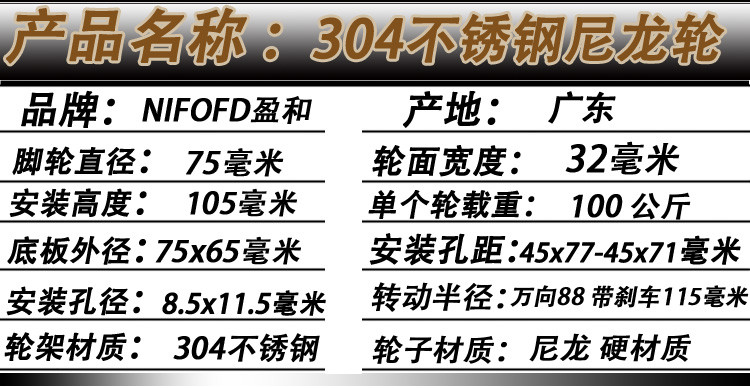 盈禾INFORD供应3寸304不锈钢尼龙活动万向轮水产防锈防水脚轮推车防腐耐磨滚轮