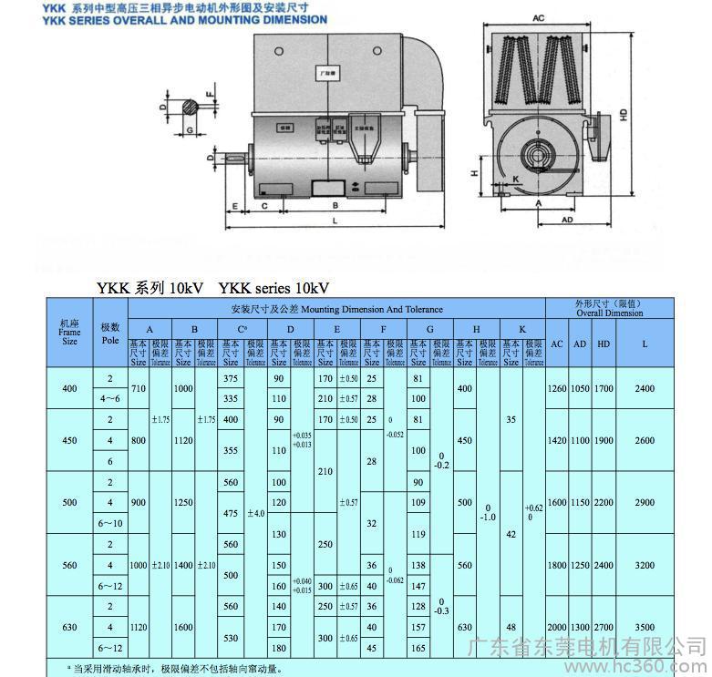 YKK355-630 6KV 三相异步电动机功率等级、安装尺寸、电气性能符合**标准JB/T10351.2-2002《YKK、YKK-W系列高压三相异步电动机技术条件{机座号355-630}》;YKK400-630 10KV三相异步电动机在功率安排上与JB/T10446-2004《Y系列10KV三相异步电动机技术条件{机座号450-630}相衔接与对应,并符合GB755-2000和相关的IEC标准。电动机采用国际上比较流行的单元组合式结构{又称箱式结构}》,机座采用钢板焊接而成,重量轻,刚性好。电动机顶部安装空-空冷却器,拆装方便,便于电动机的维护和修理。定子采用外压装结构,端部有可靠的固定及绑扎,在制造过程中经过多次匝间耐冲击电压试验及对地耐压试验,并采用先进的真空压力浸渍无溶剂漆工艺{VIP}处理,电动机采用F级绝缘结构,温升按B级考核,轴承有滚动轴承和滑动轴承两种型式,依电动机功率大小和转速而定,也可按用户的要求而定。可按订货要求提供其它电压、频率的和防护等级的电机。