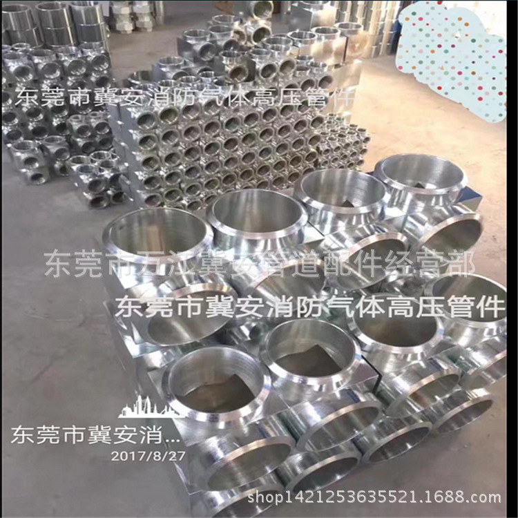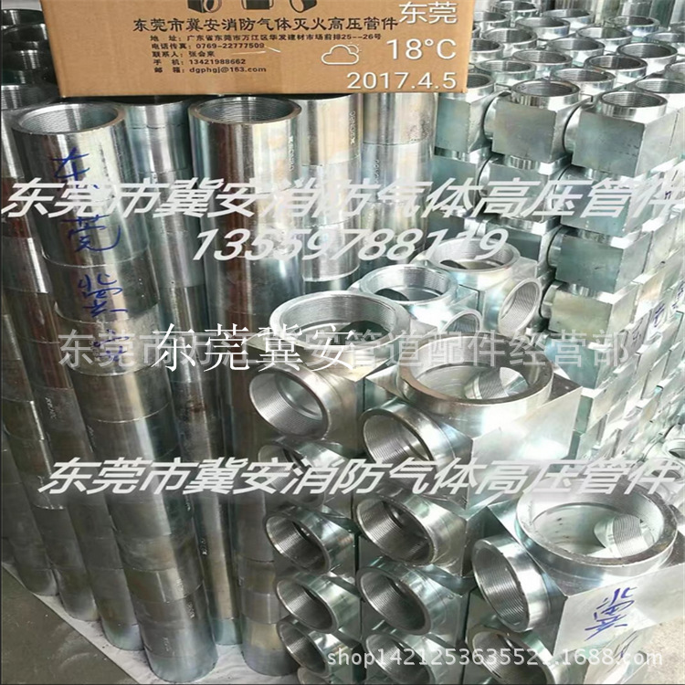 东莞冀安消防气体灭火高压管件位于东莞万江区谷涌(107国道)华发物资建材市场。我厂是专业生产消防气体灭火高压管件的私营企业,主要产品有:锻钢制螺纹管件(90°直角弯头、凹凸面对焊法兰、等异径三通/四通、直通管箍、大小头、活接、内外牙钢/铜喷头、内外丝扣接头、变径直通、补芯、外丝及管堵)和热镀锌无缝钢管。高压法兰盘配套金属垫片、热镀锌高强度螺栓。材质全部使用锻钢制20#钢,确保无气孔和砂眼,内外表电镀、热镀锌处理。型号规格有DN10、DN15、DN20、DN25、DN32、DN40、DN50、DN65、DN80、DN100、DN125、DN150等,其中DN10~DN100采用锥管螺纹方式连接;DN100~DN150采用法兰连接, 连接标准包括:55° 密封管螺纹(Rc)、60°密封管螺纹(NPT)、承插焊、管子外径坡口对焊等,全系列管件均满足气体灭火系统**高工作压力(17.2Mpa),试验压力达到26Mpa,适用于高压二氧化碳气体灭火、IG541混合气体灭火、七氟丙烷气体灭火、三氟甲烷(HFC-223)、二氧化碳(CO2)气体灭火系统等各类气体灭火系统,性能参数均符合**标准,使用安全可靠。