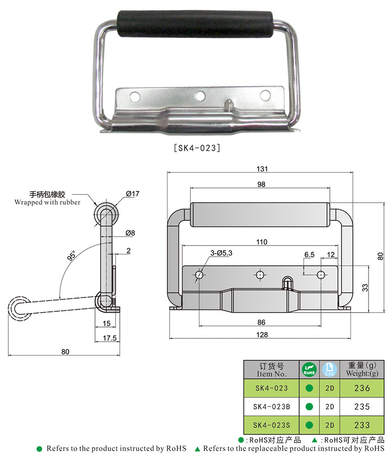 尚坤SK4-023不锈钢复位拉手 弹簧折叠拉手 自动回位拉手 小型集装箱拉手尺寸展示: