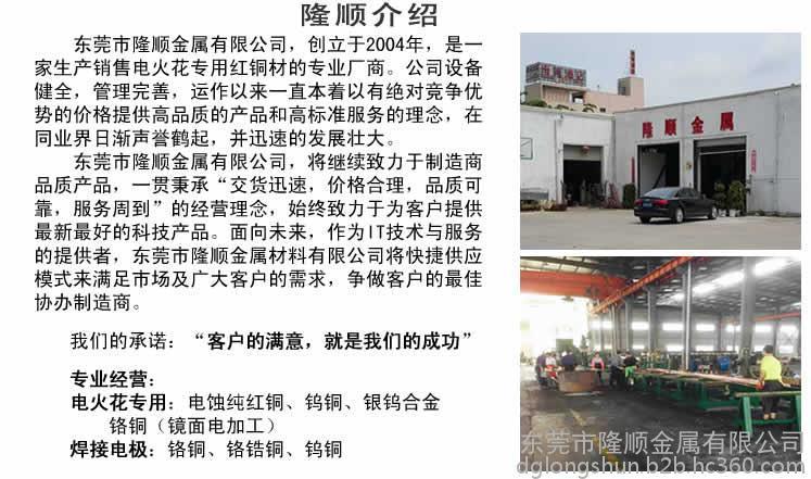 东莞市隆顺金属有限公司,创立于2004年,是一家生产销售电火花专用铜材的专业厂商。公司设备健全,管理完善,运作以来一直本着以有**竞争优势的价格提供高品质的产品和高标准服务的理念,在同业界日渐声誉鹤起,并迅速的发展壮大。