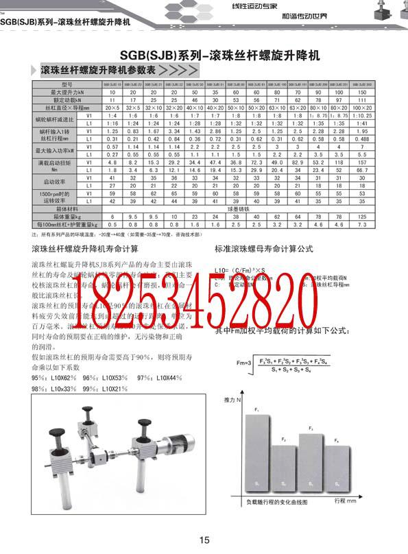 滚珠丝杠螺旋升降机SJA系列产品的主要寿命主要由滚珠丝杠的寿命及蜗轮蜗杆等零件寿命决定,我们主要校核滚珠丝杆的寿命,蜗轮蜗杆会有磨损,但寿命一般都比滚珠丝杠的寿命长。