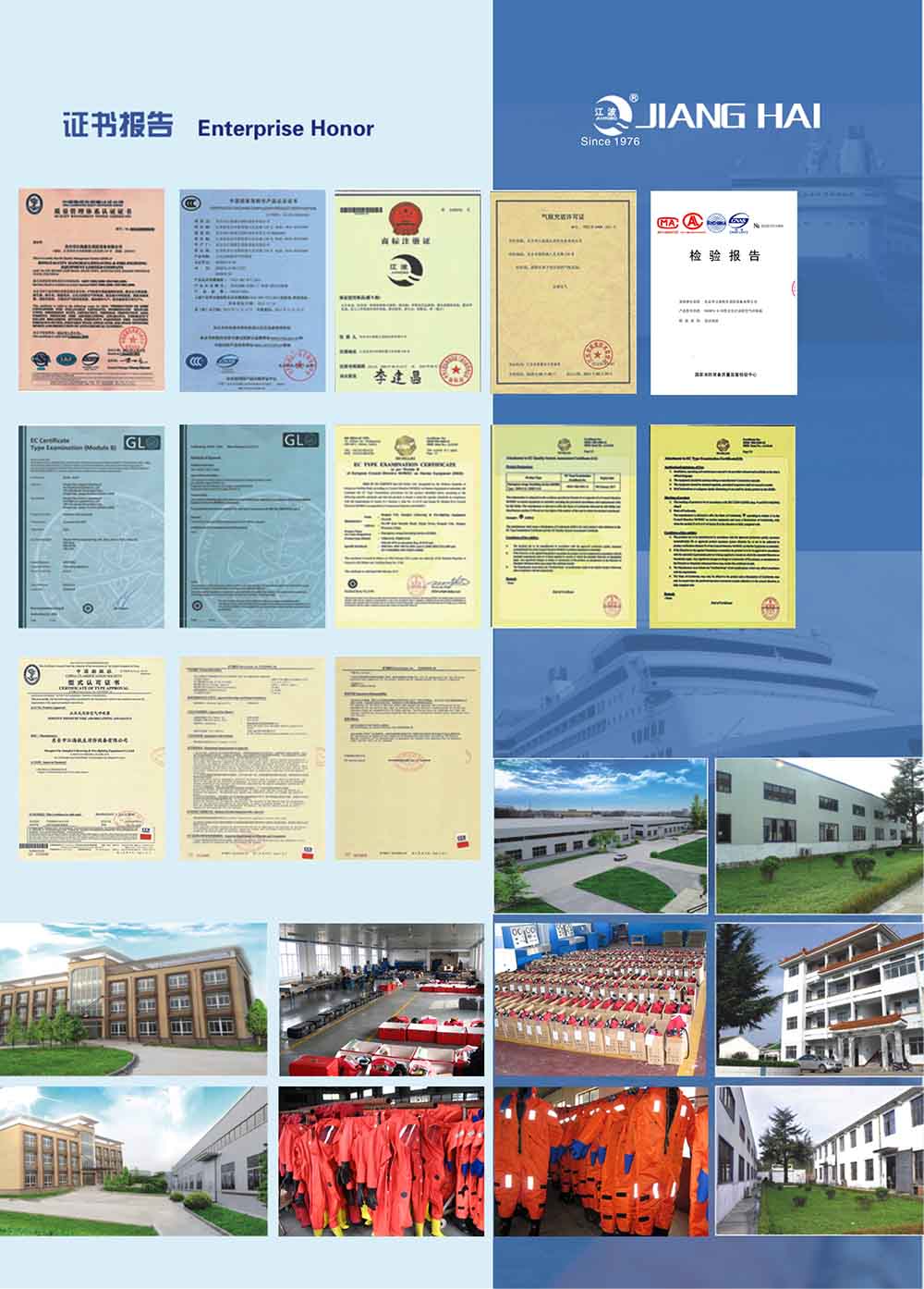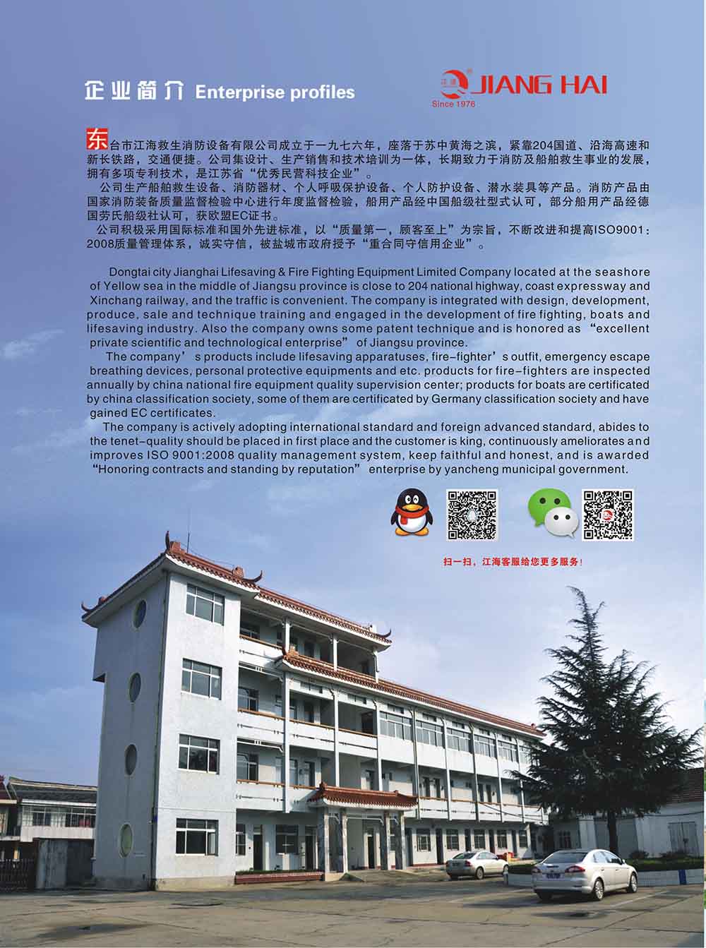 东台市江海救生消防设备有限公司是船舶救生设备、消防器材、人个呼吸保护设备、个人防护设备的生产厂。企业始建于976年,在行业内有极高的知名度,“江波”商标为盐城市知名商标。近年来不少人假冒江海公司名称在各类网站上进行虚假宣传,严重侵犯了江海公司的权利,给江海公司的声誉造成的极大的损害。不少客户通过工商行政管理部门来证实江海公司的真实性,目前盐城市东台工商行政管理局新街分局正在对假冒侵权行为进行查处。 为了维护公司的形象,防止顾客使用假冒的“江波”牌产品、保证顾客的合法利益,自2009年6月起,江海公司启用新版防伪工厂合格证,随产品提供的CCS证书中,消防员装备、空气泡沫枪的CCS证书为副本原件,消防隔热服等CCS证书上加盖有防伪专用章,请顾客注意识别。详情请浏览公司网站:www.dtjhsb.com。董事长、总经理钮静江热忱欢迎您的光临。联系电话:8575。任何与公司公布的电话不一致的,请致电工商行政管理部门查证。