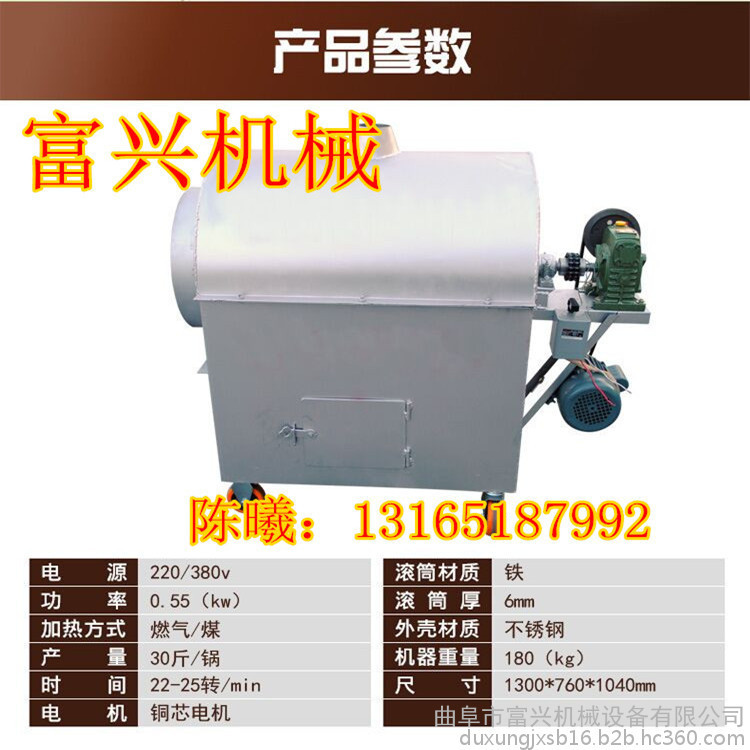 富兴客服在线QQ:3487851874电话:0537-4555886 手机:13165187992 联系人:陈曦翻炒机适用范围:中小投资创业者,栗子品牌加盟店,水果超市,菜场,集市,车站,流动人口密集的场所开店经营现炒现卖,栗子专卖店,炒货店。翻炒机用途:适合所有炒货、保健品原料加工,营养办好原料加工,中药店材原料加工,调味品与香料加工,炒咖啡豆,炒栗子,炒花生,炒瓜子,炒核桃,炒芝麻,炒豆,炒米,炒榛子,炒松子,炒开心果等各种干果类食品。翻炒机采用卧式滚筒,360度搅拌滚动,自动搅拌翻炒,加热与搅拌均匀,相对密封,焖炒效果特别好,特作炒货出入锅非常便捷,漏斗进货,省时省力,炒栗机具有自动出锅功能,操作简单,快捷,易懂等诸多优点,使用该炒货机配合我们赠送的特制配方和技术炒制的食品色泽与口味更佳,远距离香气年鼻,多用途的通用炒栗机,是目前炒货机市场上 的理想炒货机设备,为了适应各种不同的场所使用,市场子上开发了很多种机型供选择。翻炒机在过程中可以使炒货食品上下、左右、前后、全方位立体翻炒,不会出现粘小型炒栗子机的现象,炒制出的食品色泽金红亮丽,香气扑鼻。炒货出入锅十分方便,只需按动邢台炒货机械的正反转开关,电机既带动滚筒反转,炒货和小石子会一同出锅,自动分离,操作迅速快捷,省事不费力,糖炒栗子机价格不贵且操作起来既干净又卫生。