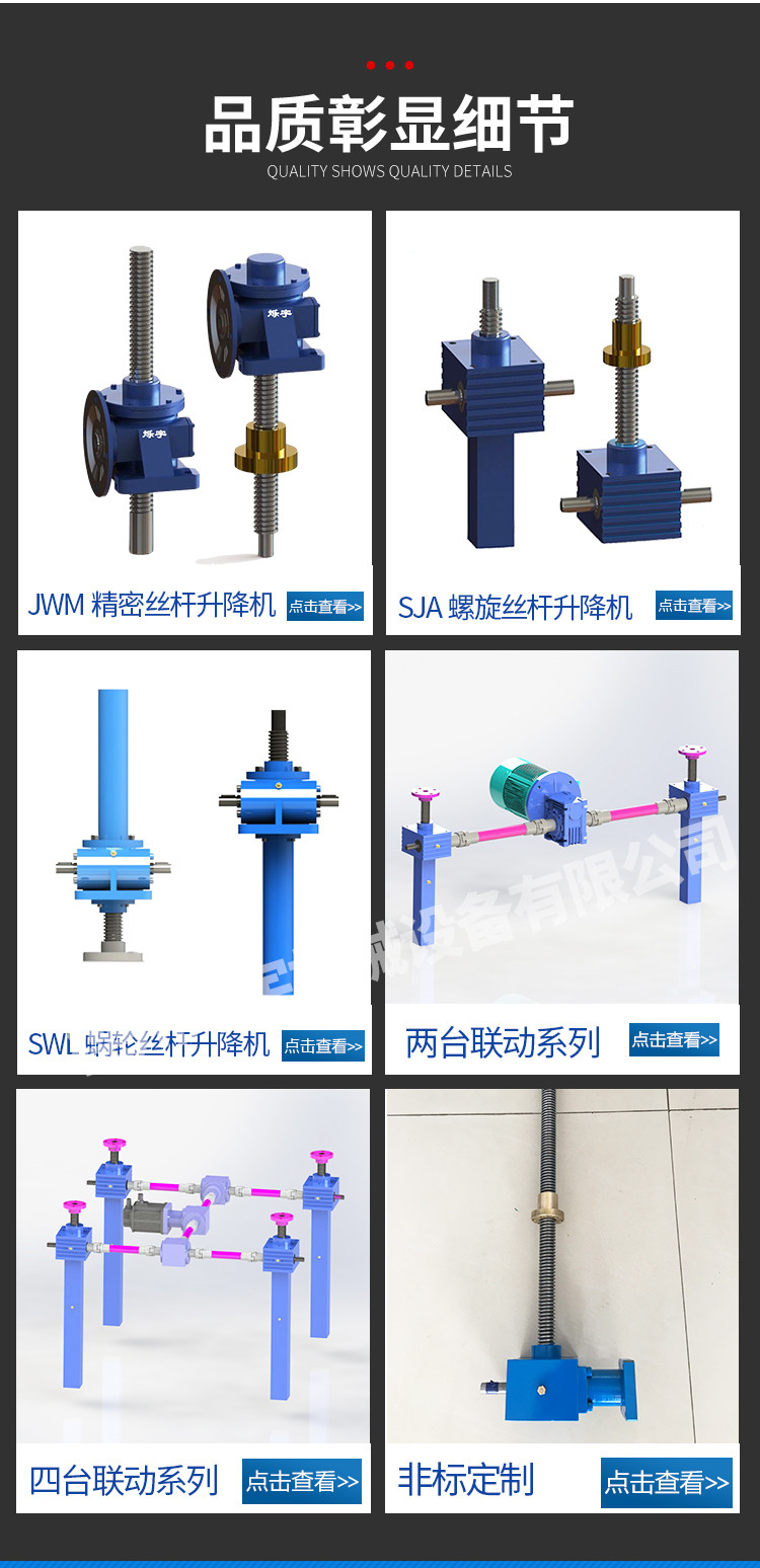 公司成立以来,一直致力于高品质国产丝杆升降机、螺旋升降机的研发销售,公司产品主要有SGA、SJB、SJ系列螺旋升降机,SWL、JWM系列丝杆升降机,T系列转向箱,以及非标丝杆升降机的设计与开发.....